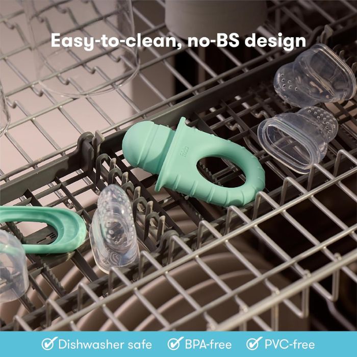 - Fill the silicone feeder with fresh or frozen fruits, vegetables, yogurt, purees, breast milk, or ice cubes. It’s the perfect fruit teether for babies.