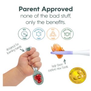 • Make the starting solids transition easier (and more fun!) for baby. Each set comes with a pre-spoon perfect for purees, doubling as a teether for sore gums, along with an open-channel spoon designed to grip soft solids.